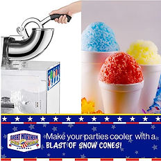 Perfect for fundraisers, poolside parties, birthdays, or other fun gatherings. this is a Commercial quality Arctic Blast Snow Cone Machine which Shaves more than 500 pounds of cube or chunk ice per hour, easy to enjoy refreshing, flavorful snow cones. Simply add standard-size ice cubes to the top shaving cage and turn the unit on--its durable blades quickly transform ice into perfectly shaved, fluffy snow. Scoop up the shaved ice from inside the main holding tank, insert into a cup or cone, and add any flavored syrup for a frosty snow-cone treat, or experiment with other fun combinations like a soda pop for a slushy drink or fresh fruit for a snow smoothie. Rents only with an inflatable! Commercial snow cone machine with 50 servings. Includes 50 snow cone cups and spoons with the choice of 2 flavors. Event Fees will Apply